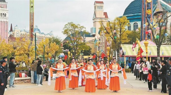 慕容古寨民俗表演也輪番登場,舞龍隊員手舉彩龍,隨著鼓點騰躍翻滾,龍身在空中劃出優美弧線﹔劃旱船的演員扭動“船身”,仿佛在碧波中穿行﹔小調扇子舞演員裙擺輕揚,扇影流轉間盡顯柔美。夜幕降臨,篝火晚會點燃,游客手拉手圍著篝火起舞,歌聲、笑聲在夜空回蕩,讓中秋佳節滿是文化韻味與團結溫情。