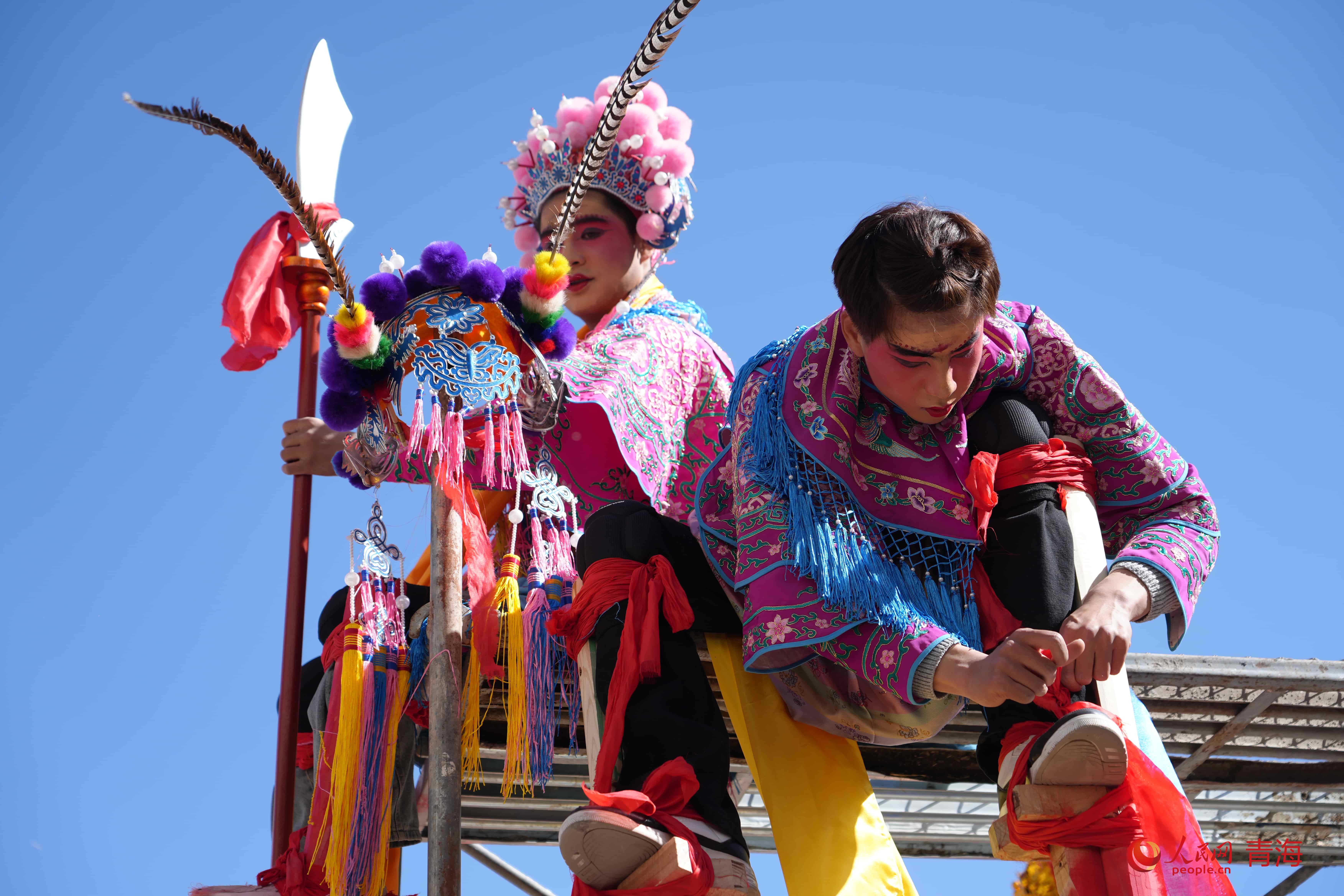 高蹺演員演出前准備。人民網 顧斐菲攝