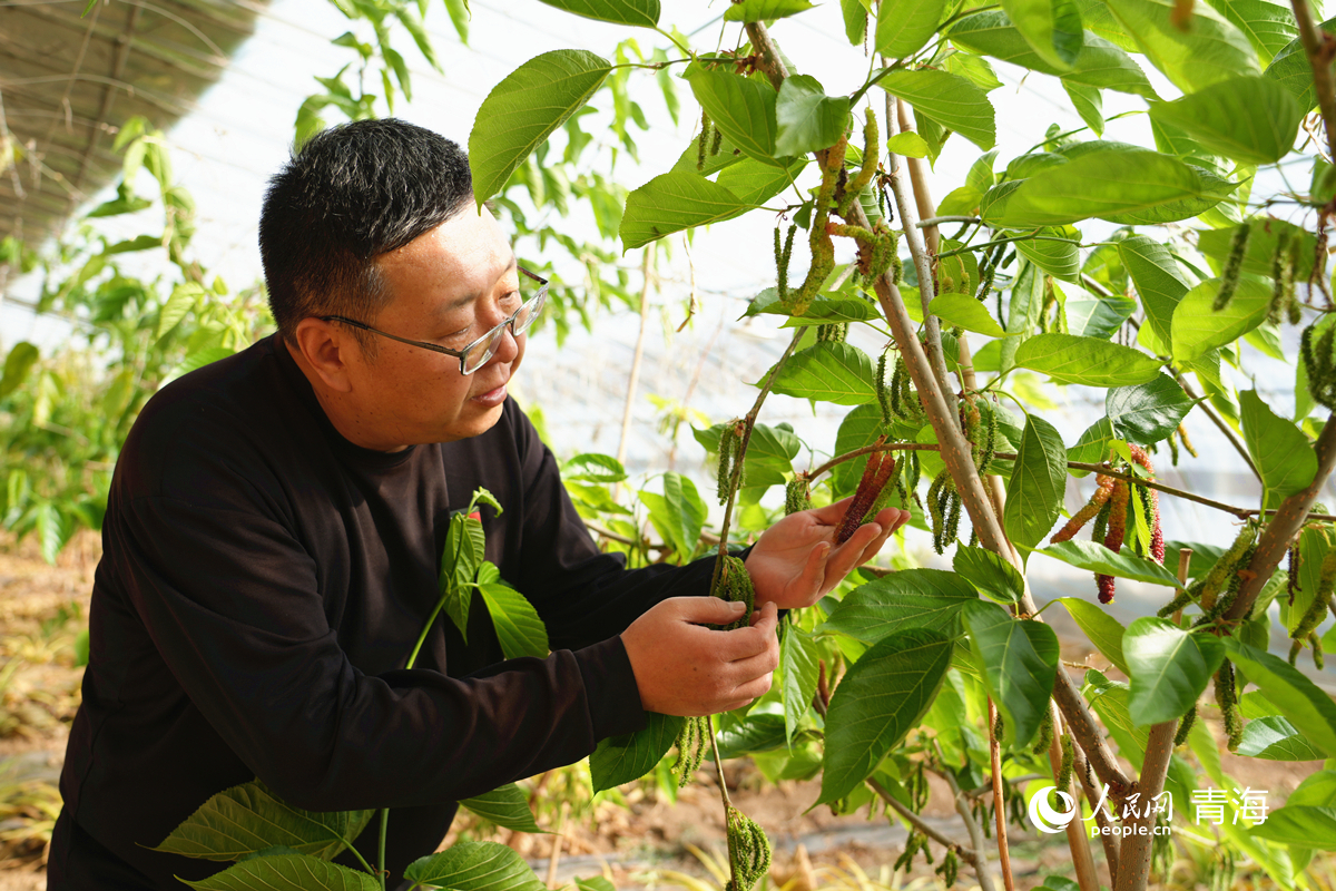 白恆瑋觀察桑葚長勢。人民網記者 楊啟紅攝