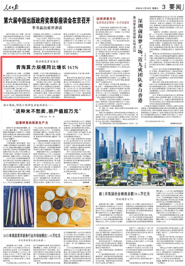 本報北京3月27日電 (記者龔仕建)記者從27日在北京舉行的第三屆青海綠色算力產業發展推介會上了解到,圍繞“1+2+N”綠色算力基地發展布局,青海省綠色算力產業發展迅速,截至2025年底,累計建成標准機架超4萬架,算力規模達2.2萬PFLOPS(每秒千萬億次浮點運算),同比增長161%。