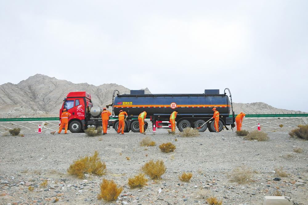 格尔木公路段养路工人在进行养路作业(2月25日摄)。 新华社记者 王浡 摄